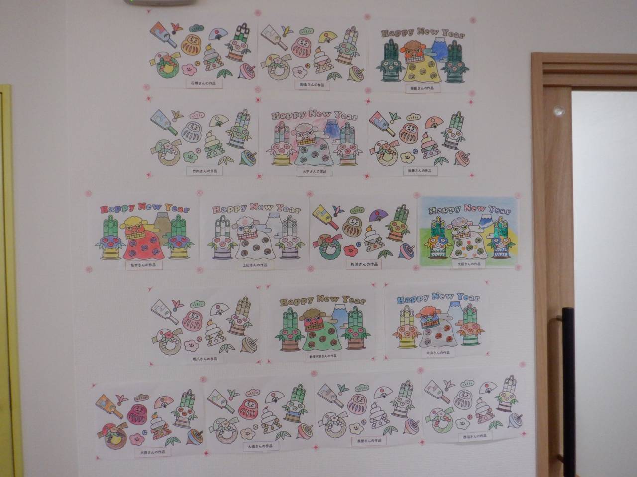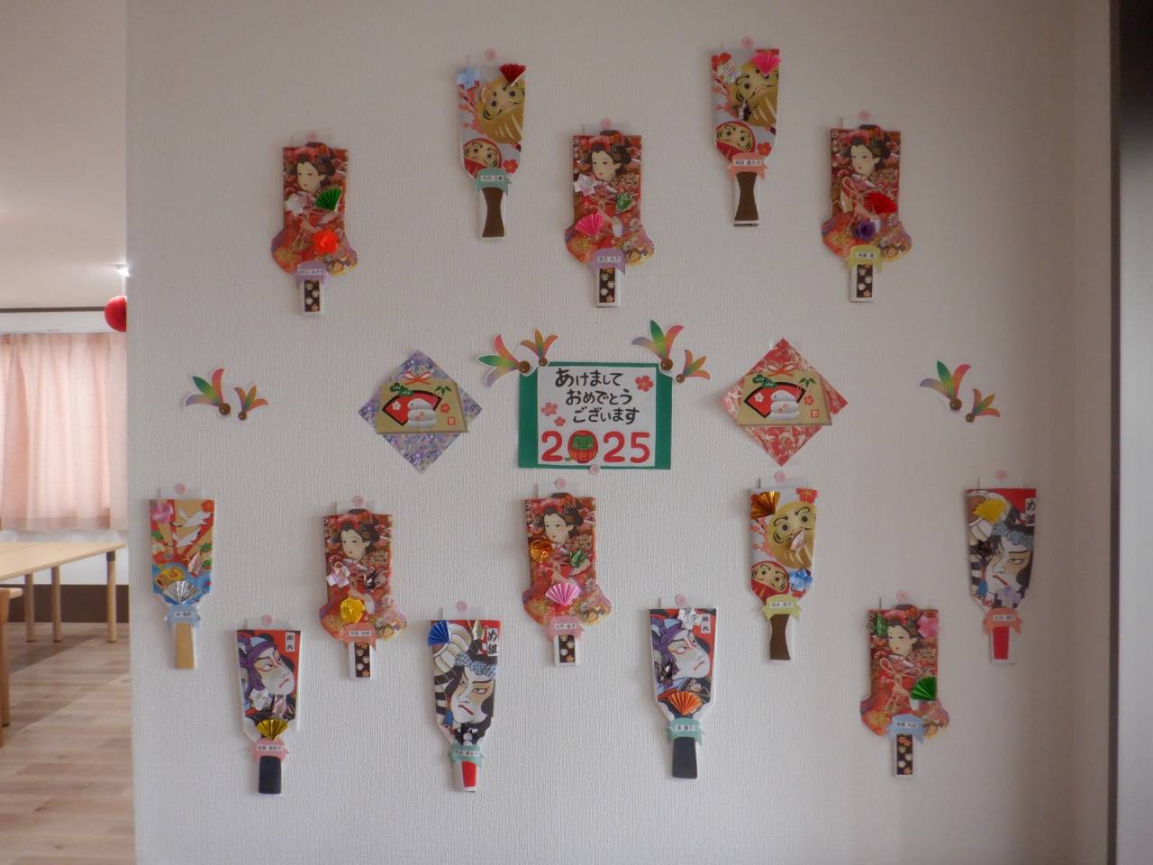 2025年 新年 お正月飾り 2025/01/02 羽子板飾り 入居者の皆さまに素敵な羽子板を作っていただきました。 お正月の塗り絵 お正月にちなんだ塗り絵を入居者の皆さまに塗っていただきました。とても綺麗にできました。