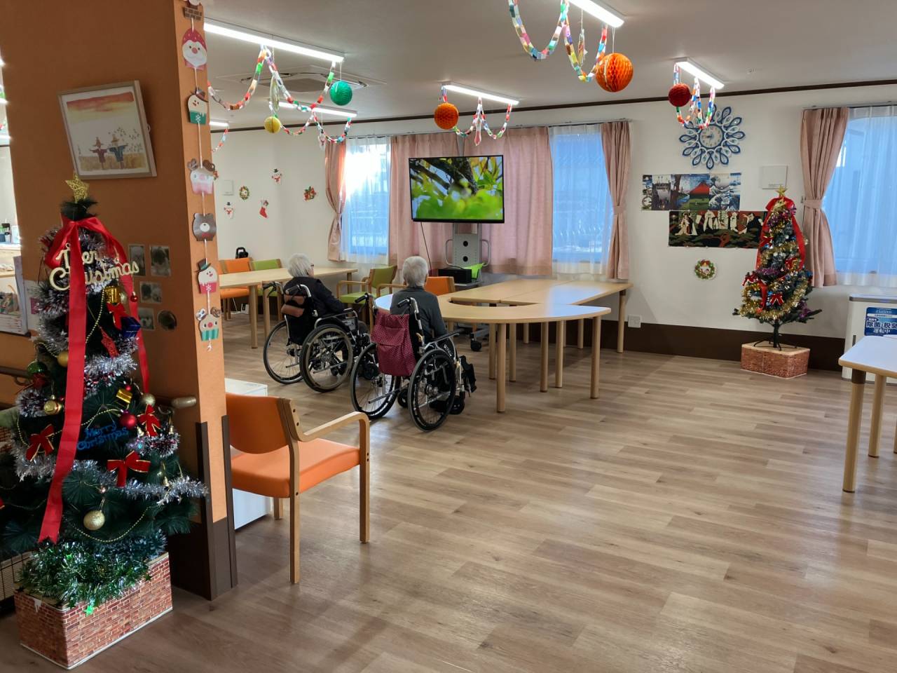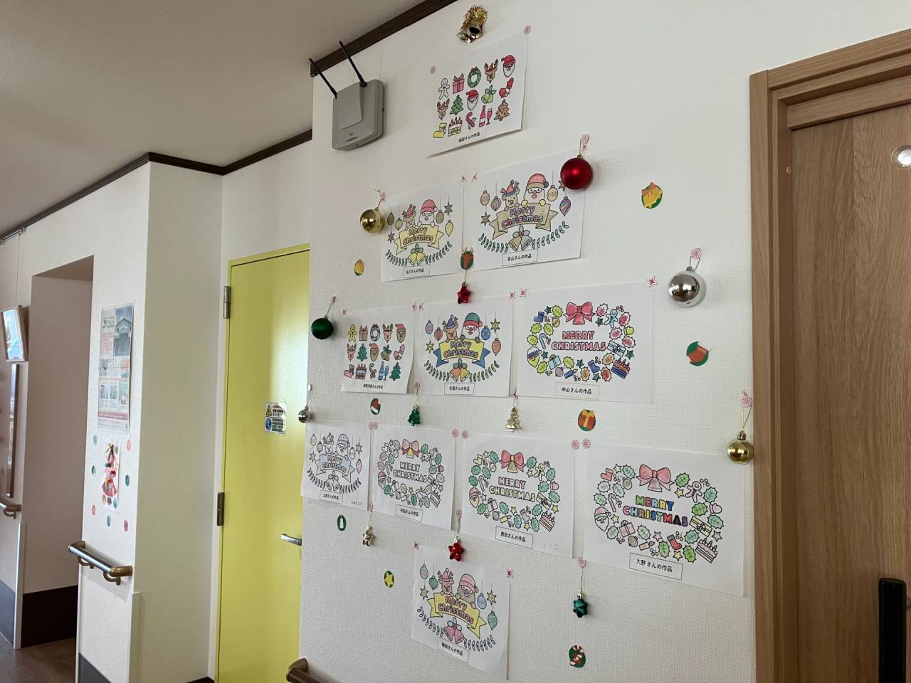 もうすぐクリスマス 2025/11/16 クリスマスツリー登場! クリスマスツリーが登場し華やかになりました。 手作りのツリー 入居者の皆さまに手作りのクリスマスツリーを作製いただきました。とっても可愛く出来ましたよ。 壁一面に飾らさせていただきました。 クリスマスの塗り絵 入居者の皆さまにクリスマスにちなんだ塗り絵を楽しんでいただきました。皆さまとっても上手に出来ました。
